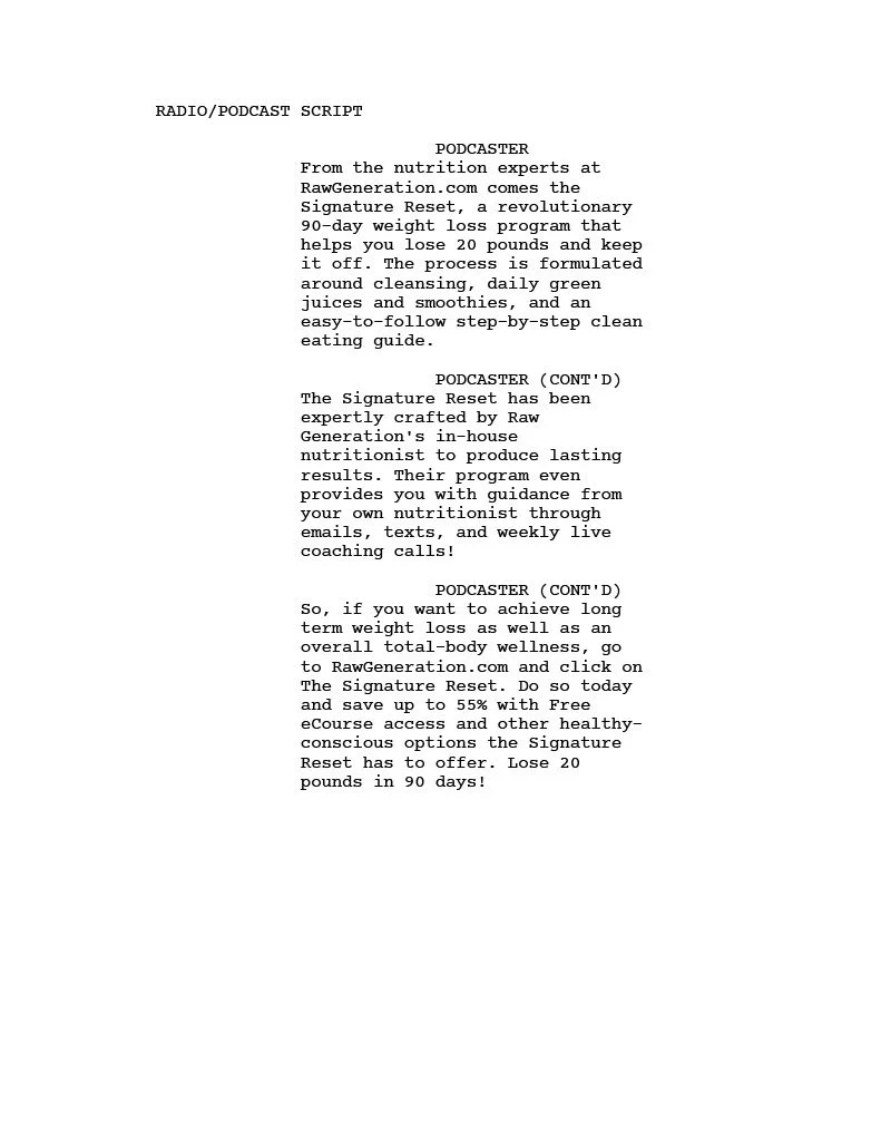 This was a script for new dieting program to be read on a radio podcast. I had to fit a large amount of information into a short, conversational window.